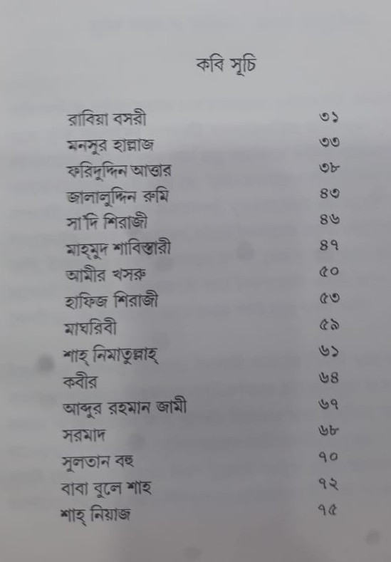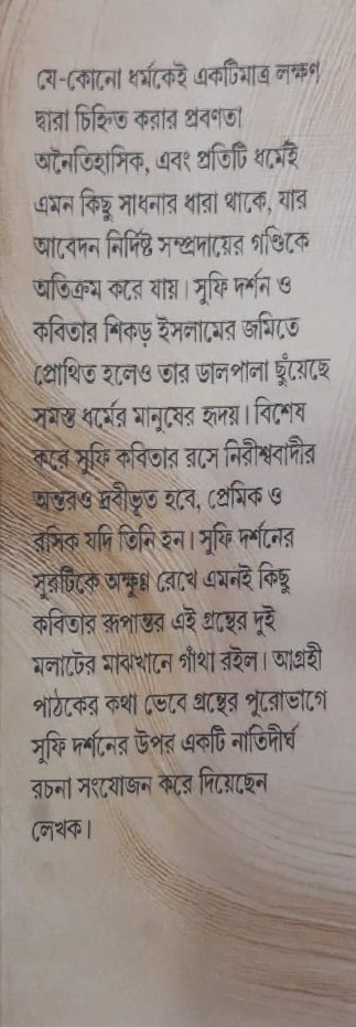 যে-কোনো ধর্মকেই একটিমাত্র লক্ষণ দ্বারা চিহ্নিত করার প্রবণতা অনৈতিহাসিক, এবং প্রতিটি ধর্মেই এমন কিছু সাধনার ধারা থাকে, যার আবেদন নির্দিষ্ট সম্প্রদায়ের গণ্ডিকে অতিক্রম করে যায়। সুফি দর্শন ও কবিতার শিকড় ইসলামের জমিতে প্রোথিত হলেও তার ডালপালা ছুঁয়েছে সমস্ত ধর্মের মানুষের হৃদয়। বিশেষ করে সুফি কবিতার রসে নিরীশ্ববাদীর অন্তরও দ্রবীভূত হবে, প্রেমিক ও রসিক যদি তিনি হন। সুফি দর্শনের সুরটিকে অক্ষুণ্ণ রেখে এমনই কিছু কবিতার রূপান্তর এই গ্রন্থের দুই মলাটের মাঝখানে গাঁথা রইল। আগ্রহী পাঠকের কথা ভেবে গ্রন্থের পুরোভাগে সুফি দর্শনের উপর একটি নাতিদীর্ঘ রচনা সংযোজন করে দিয়েছেন লেখক।