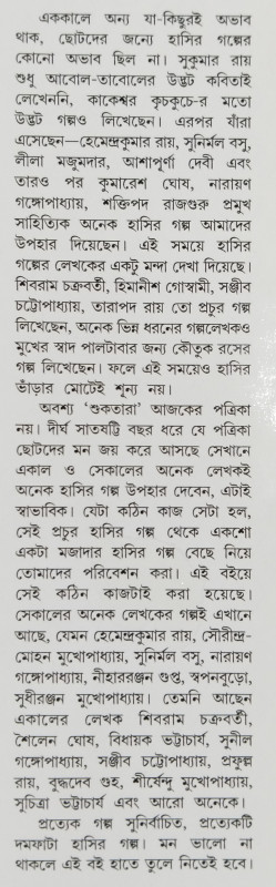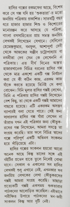হাসির গল্পের সংকলন হয়তো আরো অনেক আছে কিন্তু তাদের সঙ্গে এই বইটির প্রভেদ হাতে তুলে নিলেই বোঝা যাবে। সেকাল ও একালের সব হাসির লেখকই শুধু এখানে নেই, এখনকার সব জনপ্রিয় লেখকের লেখা কৌতুকরসের গল্পই আমরা সংগ্রহ করেছি। তাছাড়া প্রত্যেকটি গল্পই একসময় শুকতারার পাঠকদের আলোড়িত করেছিল। এইভাবে পরীক্ষিত উপায়ে পাঠকদের মন-জয়ী সংকলন কিন্তু আর দুটি নেই।