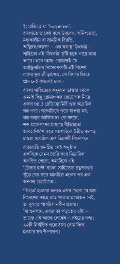 'থ্রিল্ড' হওয়ার জন্যও এখন থেকে যে আর বিদেশের কাছে হাত পাতার প্রয়োজন নেই, তা বুঝতে পারছিল নবীন প্রজন্ম। 'যা শুনলাম, এবার তা পড়তেও চাই'- তাদের এই আগ্রহ থেকেই এ বইয়ের জন্ম। ২৫টি নির্বাচিত গল্পে ঠাসা রোমাঞ্চিত হওয়ার সব উপকরণ।