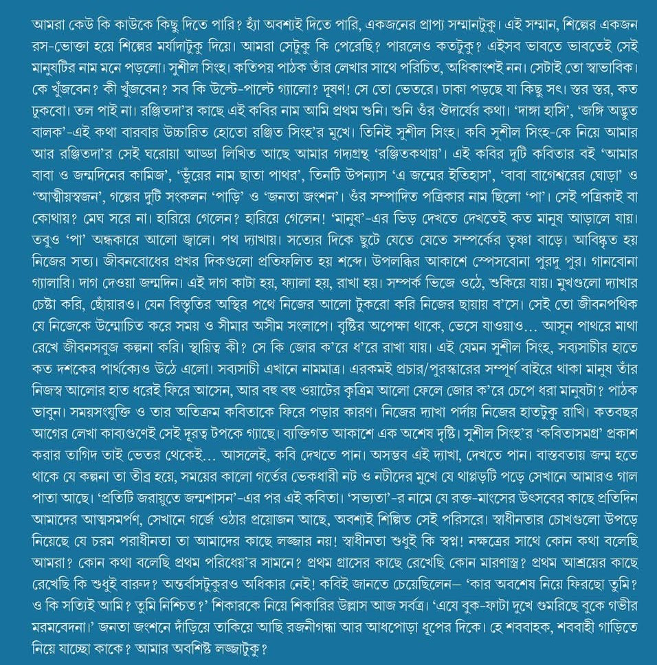 "আমরা কেউ কি কাউকে কিছু দিতে পারি? হ্যাঁ অবশ্যই দিতে পারি, একজনের প্রাপ্য সম্মানটুকু। এই সম্মান, শিল্পের একজন রস-ভোক্তা হয়ে শিল্পের মর্যাদাটুকু দিয়ে। আমরা সেটুকু কি পেরেছি? পারলেও কতটুকু? এইসব ভাবতে ভাবতেই সেই মানুষটির নাম মনে পড়লো। সুশীল সিংহ। কতিপয় পাঠক তাঁর লেখার সাথে পরিচিত, অধিকাংশই নন। সেটাই তো স্বাভাবিক। কে খুঁজবেন? কী খুঁজবেন? সব কি উল্টে-পাল্টে গ্যালো? দূষণ! সে তো ভেতরে। ঢাকা পড়ছে যা কিছু সৎ। স্তর স্তর, কত ঢুকবো। তল পাই না। রঞ্জিতদা'র কাছে এই কবির নাম আমি প্রথম শুনি। শুনি ওঁর ঔদার্যের কথা। 'দাঙ্গা হাসি', 'জঙ্গি অদ্ভুত বালক'-এই কথা বারবার উচ্চারিত হোতো রঞ্জিত সিংহ'র মুখে। তিনিই সুশীল সিংহ। কবি সুশীল সিংহ-কে নিয়ে আমার আর রঞ্জিতদা'র সেই ঘরোয়া আড্ডা লিখিত আছে আমার গদ্যগ্রন্থ 'রঞ্জিতকথায়'। এই কবির দুটি কবিতার বই 'আমার বাবা ও জন্মদিনের কামিজ', 'ভূঁয়ের নাম ছাতা পাথর', তিনটি উপন্যাস 'এ জন্মের ইতিহাস', 'বাবা বাগেশ্বরের ঘোড়া' ও 'আত্মীয়স্বজন', গল্পের দুটি সংকলন 'পাড়ি' ও 'জনতা জংশন'। ওঁর সম্পাদিত পত্রিকার নাম ছিলো 'পা'। সেই পত্রিকাই বা কোথায়? মেঘ সরে না। হারিয়ে গেলেন? হারিয়ে গেলেন! 'মানুষ'-এর ভিড় দেখতে দেখতেই কত মানুষ আড়ালে যায়। তবুও 'পা' অন্ধকারে আলো জ্বালে। পথ দ্যাখায়। সত্যের দিকে ছুটে যেতে যেতে সম্পর্কের তৃষ্ণা বাড়ে। আবিষ্কৃত হয় নিজের সত্য। জীবনবোধের প্রখর দিকগুলো প্রতিফলিত হয় শব্দে। উপলব্ধির আকাশে স্পেসবোনা পুরদু পুর। গানবোনা গ্যালারি। দাগ দেওয়া জন্মদিন। এই দাগ কাটা হয়, ফ্যালা হয়, রাখা হয়। সম্পর্ক ভিজে ওঠে, শুকিয়ে যায়। মুখগুলো দ্যাখার চেষ্টা করি, ছোঁয়ারও। যেন বিস্তৃতির অস্থির পথে নিজের আলো টুকরো করি নিজের ছায়ায় ব'সে। সেই তো জীবনপথিক যে নিজেকে উন্মোচিত করে সময় ও সীমার অসীম সংলাপে। বৃষ্টির অপেক্ষা থাকে, ভেসে যাওয়াও... আসুন পাথরে মাথা রেখে জীবনসবুজ কল্পনা করি। স্থায়িত্ব কী? সে কি জোর ক'রে ধ'রে রাখা যায়। এই যেমন সুশীল সিংহ, সব্যসাচীর হাতে কত দশকের পার্থক্যেও উঠে এলো। সব্যসাচী এখানে নামমাত্র। এরকমই প্রচার/পুরস্কারের সম্পূর্ণ বাইরে থাকা মানুষ তাঁর নিজস্ব আলোর হাত ধরেই ফিরে আসেন, আর বহু বহু ওয়াটের কৃত্রিম আলো ফেলে জোর ক'রে চেপে ধরা মানুষটা? পাঠক ভাবুন। সময়সংযুক্তি ও তার অতিক্রম কবিতাকে ফিরে পড়ার কারণ। নিজের দ্যাখা পর্দায় নিজের হাতটুকু রাখি। কতবছর আগের লেখা কাব্যগুণেই সেই দূরত্ব টপকে গ্যাছে। ব্যক্তিগত আকাশে এক অশেষ দৃষ্টি। সুশীল সিংহ'র 'কবিতাসমগ্র' প্রকাশ করার তাগিদ তাই ভেতর থেকেই... আসলেই, কবি দেখতে পান। অসম্ভব এই দ্যাখা, দেখতে পান। বাস্তবতায় জন্ম হতে থাকে যে কল্পনা তা তীব্র হয়ে, সময়ের কালো গর্তের ভেকধারী নট ও নটীদের মুখে যে থ