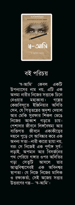 'স্ব-আমি' কেবল একটি উপন্যাসের নাম নয়, এটি এক অদম্য নারীর নিজের সত্তাকে চিনে নেওয়ার মহাকাব্য। গল্পের কেন্দ্রবিন্দুতে ইঞ্জিনিয়ার অদিতি সেন, যে পিতৃতন্ত্রের অদৃশ্য দেয়াল আর মেকি সুরক্ষার শিকল ভেঙে নিজের আকাশ গড়তে চায়। পেশাদার জীবনে লিঙ্গবৈষম্য আর ব্যক্তিগত জীবনে একাকীত্বের দহনে পুড়ে সে আবিষ্কার করে এক অনন্য সত্য-নারী কারো ছায়া নয়, বরং সে নিজেই এক পূর্ণাঙ্গ সূর্য। লড়াই, অপমান আর বিসর্জনের পথ পেরিয়ে গঙ্গার ওপর অদিতির গড়া সেতুটি আসলে তার আত্মবিশ্বাসেরই এক অবিনশ্বর স্থাপত্য। যে নিজে নিজের মালিক ও রক্ষাকর্তা, সেই অজেয় সত্তার উত্তরণের গল্প- 'স্ব-আমি'।