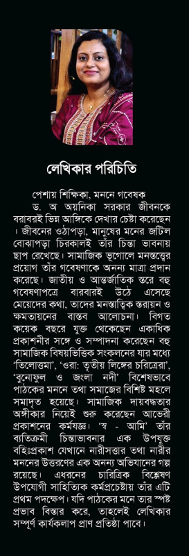 পেশায় শিক্ষিকা, মননে গবেষক ড. অ অয়নিকা সরকার জীবনকে বরাবরই ভিন্ন আঙ্গিকে দেখার চেষ্টা করেছেন । জীবনের ওঠাপড়া, মানুষের মনের জটিল বোঝাপড়া চিরকালই তাঁর চিন্তা ভাবনায় ছাপ রেখেছে। সামাজিক ভূগোলে মনস্তত্ত্বের প্রয়োগ তাঁর গবেষণাকে অনন্য মাত্রা প্রদান করেছে। জাতীয় ও আন্তর্জাতিক স্তরে বহু গবেষণাপত্রে বারবারই উঠে এসেছে মেয়েদের কথা, তাদের মনস্তাত্বিক স্তরায়ন ও ক্ষমতায়নের বাস্তব আলোচনা। বিগত কয়েক বছরে যুক্ত থেকেছেন একাধিক প্রকাশনীর সঙ্গে ও সম্পাদনা করেছেন বহু সামাজিক বিষয়ভিত্তিক সংকলনের যার মধ্যে 'তিলোত্তমা', 'ওরা: তৃতীয় লিঙ্গের চরিত্রেরা', 'বুনোফুল ও জংলা নদী' বিশেষভাবে পাঠকের মননে তথা সমাজের বিশিষ্ট মহলে সমাদৃত হয়েছে। সামাজিক দায়বদ্ধতার অঙ্গীকার নিয়েই শুরু করেছেন আভেরী প্রকাশনের কর্মযজ্ঞ। 'স্ব আমি' তাঁর ব্যতিক্রমী চিন্তাভাবনার এক উপযুক্ত বহিঃপ্রকাশ যেখানে নারীসত্তার তথা নারীর মননের উত্তরণের এক অনন্য অভিযানের গল্প রয়েছে। এধরনের চারিত্রিক বিশ্লেষণ উপযোগী সাহিত্যিক কর্মপ্রচেষ্টায় তাঁর এটি প্রথম পদক্ষেপ। যদি পাঠকের মনে তার স্পষ্ট প্রভাব বিস্তার করে, তাহলেই লেখিকার সম্পূর্ণ কার্যকলাপ প্রাণ প্রতিষ্ঠা পাবে।