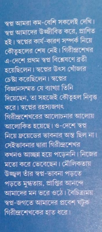 স্বপ্ন আমরা কম-বেশি সকলেই দেখি। স্বপ্ন আমাদের উজ্জীবিত করে, প্রাণিত হই। স্বপ্নের কার্য-কারণ সম্পর্ক নিয়ে কৌতূহলের শেষ নেই। গিরীন্দ্রশেখর এদেশে প্রথম স্বপ্ন বিশ্লেষণে ব্রতী হয়েছিলেন। স্বপ্নের উৎস খোঁজার চেষ্টা করেছিলেন। স্বপ্নের বিজ্ঞানসম্মত যে ব্যাখ্যা তিনি দিয়েছেন, তা সহজেই কৌতূহল নিবৃত্ত করে। স্বপ্নের রহস্যজগতে আলো দেখিয়েছেন তিনি। ওদেশে স্বপ্ন নিয়ে ফ্রয়েডের ভাবনার অন্ত ছিল না। কিন্তু সেই ভাবনায় গিরীন্দ্রশেখর আচ্ছন্ন হননি। মৌলিকতায় উজ্জ্বল তাঁর স্বপ্ন-ভাবনা পড়তে পড়তে মুগ্ধতায়, প্রাপ্তির আনন্দে মন ভরে ওঠে।