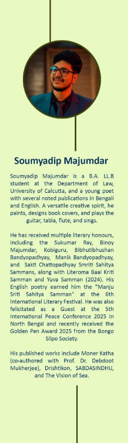 Soumyadip Majumdar is a B.A. LL.B student at the Department of Law, University of Calcutta, and a young poet with several noted publications in Bengali and English. A versatile creative spirit, he paints, designs book covers, and plays the guitar, tabla, flute, and sings.