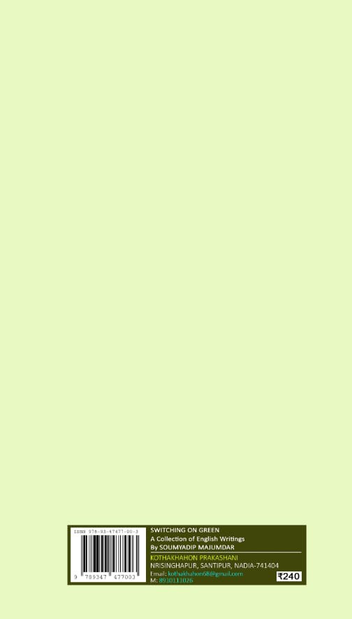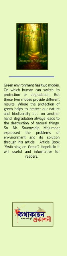 Green environment has two modes. On which human can switch its protection or degradation. But these two modes provide different results. Where the protection of green helps to protect our nature and biodiversity but, on another hand, degradation always leads to the destruction of natural things. So, Mr. Soumyadip Majumdar expressed the problems of en-vironment and its solution through his article. Article Book "Switching on Green". Hopefully it will useful and informative for readers.