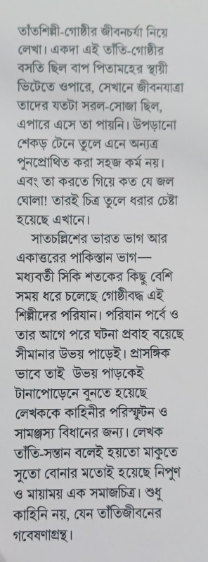 তাঁতশিল্পী-গোষ্ঠীর জীবনচর্যা নিয়ে লেখা। একদা এই তাঁতি-গোষ্ঠীর বসতি ছিল বাপ পিতামহের স্থায়ী ভিটেতে ওপারে, সেখানে জীবনযাত্রা তাদের যতটা সরল-সোজা ছিল, এপারে এসে তা পায়নি। উপড়ানো শেকড় টেনে তুলে এনে অন্যত্র পুনপ্রোথিত করা সহজ কর্ম নয়। এবং তা করতে গিয়ে কত যে জল ঘোলা! তারই চিত্র তুলে ধরার চেষ্টা হয়েছে এখানে।