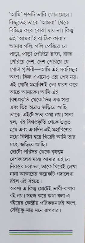ছোটো পরিসর থেকে বৃহত্তম দেশকালের মধ্যে আমার এই যে নিরন্তর চলাচল, তাকে ঘিরেই লেখা নানা আকারের কয়েকটি গদ্যলেখা রইল এই বইতে।