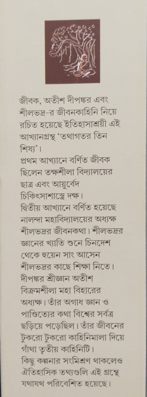 জীবক, অতীশ দীপঙ্কর এবং শীলভদ্র-র জীবনকাহিনি নিয়ে রচিত হয়েছে ইতিহাসাশ্রয়ী এই আখ্যানগ্রন্থ 'তথাগতর তিন শিষ্য'।