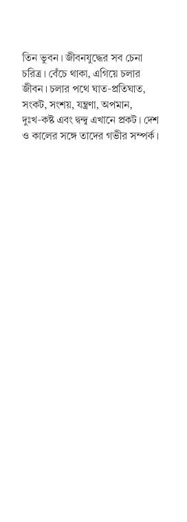 তিন ভুবন। জীবনযুদ্ধের সব চেনা চরিত্র। বেঁচে থাকা, এগিয়ে চলার জীবন। চলার পথে ঘাত-প্রতিঘাত, সংকট, সংশয়, যন্ত্রণা, অপমান, দুঃখ-কষ্ট এবং দ্বন্দু এখানে প্রকট। দেশ ও কালের সঙ্গে তাদের গভীর সম্পর্ক।