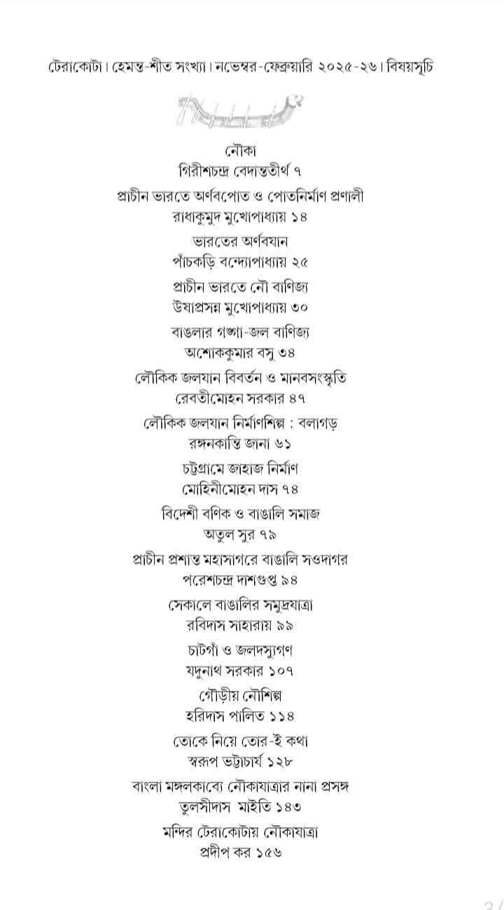 নৌকা, নৌকা নির্মাণশিল্প, বাঙালির নৌ বাণিজ্য, জলযান এবং মানব সংস্কৃতি, বাঙালির সমুদ্রযাত্রা, বাঙালি সওদাগর, জলদস্যু ইত্যাদি বিষয় নিয়ে অসংখ্য ছবিসহ ১৬০ পৃষ্ঠার পত্রিকা।