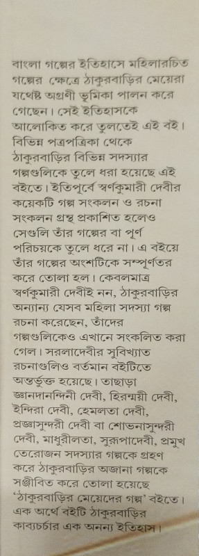 বাংলা গল্পের ইতিহাসে মহিলারচিত গল্পের ক্ষেত্রে ঠাকুরবাড়ির মেয়েরা যথেষ্ট অগ্রণী ভূমিকা পালন করে গেছেন। সেই ইতিহাসকে আলোকিত করে তুলতেই এই বই। বিভিন্ন পত্রপত্রিকা থেকে ঠাকুরবাড়ির বিভিন্ন সদস্যার গল্পগুলিকে তুলে ধরা হয়েছে এই বইতে। ইতিপূর্বে স্বর্ণকুমারী দেবীর কয়েকটি গল্প সংকলন ও রচনা সংকলন গ্রন্থ প্রকাশিত হলেও সেগুলি তাঁর গল্পের বা পূর্ণ পরিচয়কে তুলে ধরে না। এ বইয়ে তাঁর গল্পের অংশটিকে সম্পূর্ণতর করে তোলা হল। কেবলমাত্র স্বর্ণকুমারী দেবীই নন, ঠাকুরবাড়ির অন্যান্য যেসব মহিলা সদস্যা গল্প রচনা করেছেন, তাঁদের গল্পগুলিকেও এখানে সংকলিত করা গেল। সরলাদেবীর সুবিখ্যাত রচনাগুলিও বর্তমান বইটিতে অন্তর্ভুক্ত হয়েছে। তাছাড়া জ্ঞানদানন্দিনী দেবী, হিরন্ময়ী দেবী ইন্দিরা দেবী, হেমলতা দেবী, প্রজ্ঞাসুন্দরী দেবী বা শোভনাসুন্দরী দেবী, মাধুরীলতা, সুরূপাদেবী, প্রমুখ তেরোজন সদস্যার গল্পকে গ্রহণ করে ঠাকুরবাড়ির অজানা গল্পকে সঞ্জীবিত করে তোলা হয়েছে 'ঠাকুরবাড়ির মেয়েদের গল্প' বইতে। এক অর্থে বইটি ঠাকুরবাড়ির কাব্যচর্চার এক অনন্য ইতিহাস।