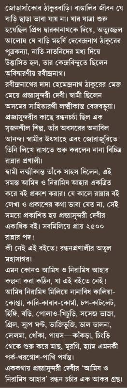 কী নেই এই বইতে! রন্ধনপ্রণালীর অতুল মহাসাগর। এমন কোনও আমিষ ও নিরামিষ আহার কল্পনা করা কঠিন, যা এই বইতে নেই!