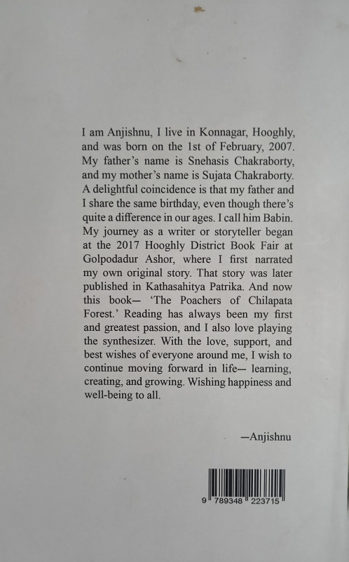 My father's name is Snehasis Chakraborty, and my mother's name is Sujata Chakraborty. A delightful coincidence is that my father and I share the same birthday, even though there's quite a difference in our ages. I call him Babin. My journey as a writer or storyteller began at the 2017 Hooghly District Book Fair at Golpodadur Ashor, where I first narrated my own original story. That story was later published in Kathasahitya Patrika. And now this book 'The Poachers of Chilapata Forest. Reading has always been my first and greatest passion, and I also love playing the synthesizer. With the love, support, and best wishes of everyone around me, I wish to continue moving forward in life- learning, creating, and growing. Wishing happiness and well-being to all.