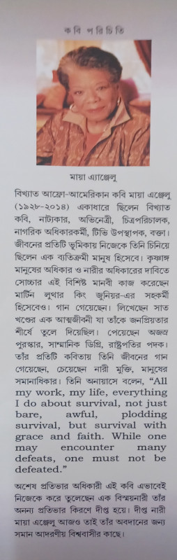 তিনি জানতেন খাঁচার পাখি কেন গান গায়। তিনি জানতেন কৃষ্ণাঙ্গ মানুষদের জীবনের কথকতা। তিনি যেমন একাধারে কবি তেমনই অন্যদিকে নাট্যকার, চিত্র পরিচালক, সমাজকর্মী, টিভি উপস্থাপক ইত্যাদি। অসংখ্য কবিতা তাঁর। কখনো তিনি প্রতিবাদী আবার কখনো তিনি প্রেমিক। তিনি হলেন “মায়া এ্যাঞ্জেলু”। তাঁর কলম বিশ্ব সাহিত্যকে সমৃদ্ধ করেছে।