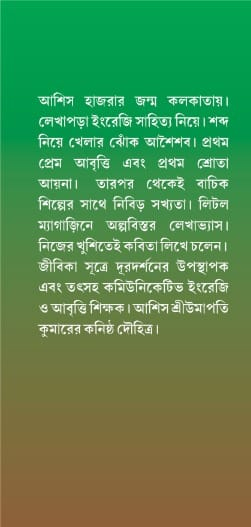 আশিস হাজরার জন্ম কলকাতায়। লেখাপড়া ইংরেজি সাহিত্য নিয়ে। শব্দ নিয়ে খেলার ঝোঁক আশৈশব। প্রথম প্রেম আবৃত্তি এবং প্রথম শ্রোতা আয়না। তারপর থেকেই বাচিক শিল্পের সাথে নিবিড় সখ্যতা। লিটল ম্যাগাজিনে অল্পবিস্তর লেখাভ্যাস। নিজের খুশিতেই কবিতা লিখে চলেন। জীবিকা সূত্রে দূরদর্শনের উপস্থাপক এবং তৎসহ কমিউনিকেটিভ ইংরেজি ও আবৃত্তি শিক্ষক। আশিস শ্রীউমাপতি কুমারের কনিষ্ঠ দৌহিত্র।