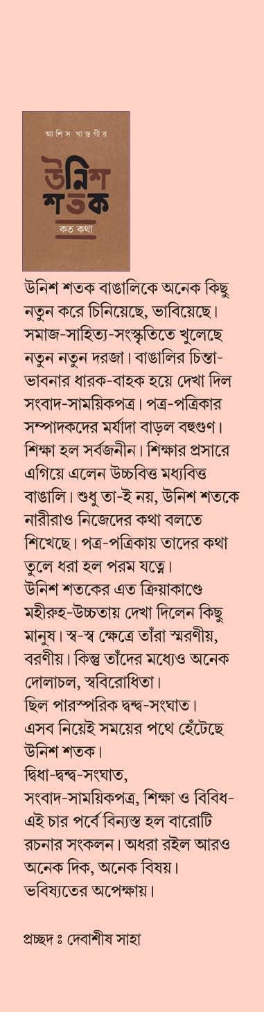 উনিশ শতকের এত ক্রিয়াকাণ্ডে মহীরুহ-উচ্চতায় দেখা দিলেন কিছু মানুষ। স্ব-স্ব ক্ষেত্রে তাঁরা স্মরণীয়, বরণীয়। কিন্তু তাঁদের মধ্যেও অনেক দোলাচল, স্ববিরোধিতা। ছিল পারস্পরিক দ্বন্দ্ব-সংঘাত। এসব নিয়েই সময়ের পথে হেঁটেছে উনিশ শতক।