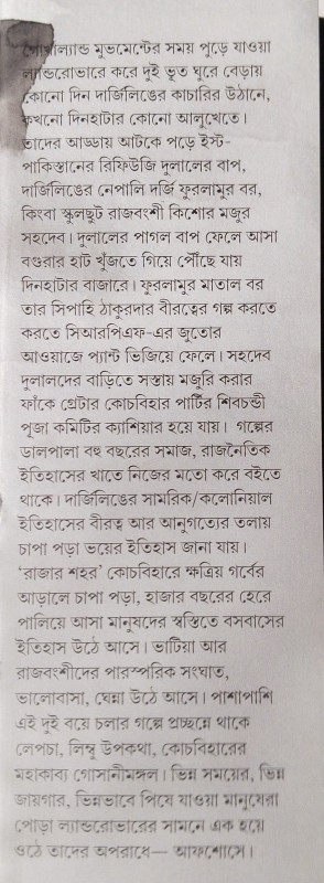 গোর্খাল্যান্ড মুভমেন্টের সময় পুড়ে যাওয়া ল্যান্ডরোভারে করে দুই ভূত ঘুরে বেড়ায় কোনো দিন দার্জিলিঙের কাচারির উঠানে, কখনো দিনহাটার কোনো আলুখেতে। তাদের আড্ডায় আটকে পড়ে ইস্ট-পাকিস্তানের রিফিউজি দুলালের বাপ, দার্জিলিঙের নেপালি দর্জি ফুরলামুর বর, কিংবা স্কুলছুট রাজবংশী কিশোর মজুর সহদেব। দুলালের পাগল বাপ ফেলে আসা বগুরার হাট খুঁজতে গিয়ে পৌঁছে যায় দিনহাটার বাজারে। ফুরলামুর মাতাল বর তার সিপাহি ঠাকুরদার বীরত্বের গল্প করতে করতে সিআরপিএফ-এর জুতোর আওয়াজে প্যান্ট ভিজিয়ে ফেলে। সহদেব দুলালদের বাড়িতে সস্তায় মজুরি করার ফাঁকে গ্রেটার কোচবিহার পার্টির শিবচন্ডী পূজা কমিটির ক্যাশিয়ার হয়ে যায়। গল্পের ডালপালা বহু বছরের সমাজ, রাজনৈতিক ইতিহাসের খাতে নিজের মতো করে বইতে থাকে। দার্জিলিঙের সামরিক/কলোনিয়াল ইতিহাসের বীরত্ব আর আনুগত্যের তলায় চাপা পড়া ভয়ের ইতিহাস জানা যায়। 'রাজার শহর' কোচবিহারে ক্ষত্রিয় গর্বের আড়ালে চাপা পড়া, হাজার বছরের হেরে পালিয়ে আসা মানুষদের স্বস্তিতে বসবাসের ইতিহাস উঠে আসে। ভাটিয়া আর রাজবংশীদের পারস্পরিক সংঘাত, ভালোবাসা, ঘেন্না উঠে আসে। পাশাপাশি এই দুই বয়ে চলার গল্পে প্রচ্ছন্নে থাকে লেপচা, লিম্ব উপকথা, কোচবিহারের মহাকাব্য গোসানীমঙ্গল। ভিন্ন সময়ের, ভিন্ন জায়গার, ভিন্নভাবে পিষে যাওয়া মানুষেরা পোড়া ল্যান্ডরোভারের সামনে এক হয়ে ওঠে তাদের অপরাধে- আফশোসে।
