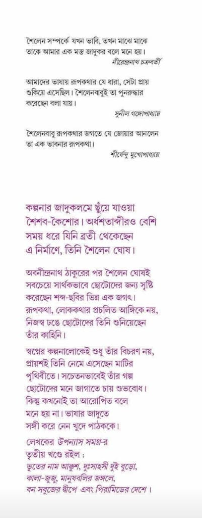 লেখকের উপন্যাস সমগ্র-র তৃতীয় খণ্ডে রইল : ভূতের নাম আক্কুশ, দুঃসাহসী দুই বুড়ো, কালা-জুজু, মানুষবলির জঙ্গলে, বন সবুজের দ্বীপে এবং পিরামিডের দেশে।