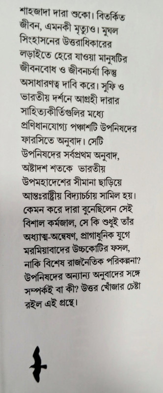 শাহজাদা দারা শুকো। বিতর্কিত জীবন, এমনকী মৃত্যুও। মুঘল সিংহাসনের উত্তরাধিকারের লড়াইতে হেরে যাওয়া মানুষটির জীবনবোধ ও জীবনচর্যা কিন্তু অসাধারণত্ব দাবি করে। সুফি ও ভারতীয় দর্শনে আগ্রহী দারার সাহিত্যকীর্তিগুলির মধ্যে প্রণিধানযোগ্য পঞ্চাশটি উপনিষদের ফারসিতে অনুবাদ। সেটি উপনিষদের সর্বপ্রথম অনুবাদ, অষ্টাদশ শতকে ভারতীয় উপমহাদেশের সীমানা ছাড়িয়ে আন্তঃরাষ্ট্রীয় বিদ্যাচর্চায় সামিল হয়। কেমন করে দারা বুনেছিলেন সেই বিশাল কর্মজাল, সে কি শুধুই তাঁর অধ্যাত্ম-অন্বেষণ, প্রাগাধুনিক যুগে মরমিয়াবাদের উচ্চকোটির ফসল, নাকি বিশেষ রাজনৈতিক পরিকল্পনা? উপনিষদের অন্যান্য অনুবাদের সঙ্গে সম্পর্কই বা কী? উত্তর খোঁজার চেষ্টা রইল এই গ্রন্থে।