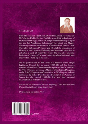 Noted historian and politician, Dr. Radha Kumud Mookherji, Ex-M.P., M.A., Ph.D., D.Litt., F.A.S.B., started life as Professor of History in the Bengal National College, under the Principalship of the late Sri Aurobindo. Subsequently he joined the Mysore University where he was Professor of History from 1917 to 1921. Thereafter he became Professor and Head of the Department of History in the Lucknow University and remained there for an unbroken period of twenty-five years. He was also Emeritus Professor of History of the same University where his friends have endowed a Lectureship in his name.