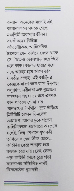 অন্যান্য অনেকের মতোই এই করোনাকালে থমকে গেছে মঞ্চশিল্পী অরণ্যের জীবন। বদ্ধজীবনের বিচ্ছিন্ন অতিলৌকিক, আধিদৈবিক টানেলে যেন তলিয়ে যেতে থাকে সে। চৈতন্য তোলপাড় করে উড়ে চলে কাক। কাকের ছায়ার সঙ্গে যুদ্ধ আচ্ছন্ন হয়ে আসে তার যাবতীয় প্রত্যহ। এই কাহিনি কেন্দ্রকে ধারণ করে রাখে উদ্বাস্তু অধ্যুষিত, নদীহারা এক পুরোনো মফস্সল শহর। যেখানে এখনও কান পাতলে শোনা যায় রানওয়ের দীর্ঘশ্বাস। দূরে দাঁড়িয়ে মিটিমিটি হাসেন ভিনসেন্ট ভ্যানগঘ! আবার ঢুকে পড়েন কাহিনিকেন্দ্রে একেবারে অরণ্যের সঙ্গেই কিন্তু সেখানে ধূমাবতী দেবী তাকিয়ে থাকেন তীক্ষ্ণ চোখে…কাহিনির কেন্দ্র ভাঙচুর হয়ে রক্তাক্ত হয়ে যায়। সেই ভেঙে পড়া কাহিনি থেকে চুয়ে পড়া রক্তদাগের সম্মিলিত নামই ভিনসেন্টের ধূমাবতী।
