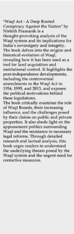 "Waqf Act - A Deep Rooted Conspiracy Against the Nation" by Nishith Pramanik is a thought-provoking analysis of the Waqf system and its implications for India’s sovereignty and integrity. The book delves into the origins and historical evolution of Waqf, revealing how it has been used as a tool for land acquisition and institutional control. It highlights the post-independence developments, including the controversial amendments to the Waqf Act in 1954, 1995, and 2013, and exposes the political motivations behind these legislations. The book critically examines the role of Waqf Boards, their increasing influence, and the challenges posed by their claims on public and private properties. It also sheds light on the appeasement politics surrounding Waqf and the resistance to necessary legal reforms. Through detailed research and factual analysis, this book urges readers to understand the underlying threats posed by the Waqf system and the urgent need for corrective measures