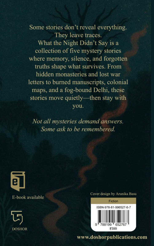 What the Night Didn't Say is a collection of five mystery stories where memory, silence, and forgotten truths shape what survives. From hidden monasteries and lost war letters to burned manuscripts, colonial maps, and a fog-bound Delhi, these stories move quietly-then stay with you.