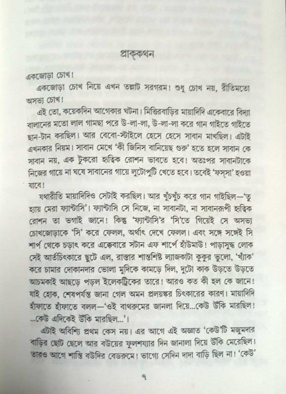 যথারীতি মায়াদিদিও সেটাই করছিল। আর খুঁচখুঁচ করে গান গাইছিল-'তু হ্যায় মেরা ফ্যান্টাসি'। ফ্যান্টাসি সে নিজে, না সাবানটা, না সাবানরূপী হৃত্বিক রোশন তা ভগাই জানে! কিন্তু 'ফ্যান্টাসি'র 'সি'তে গিয়েই সে অসভ্য চোখজোড়াকে 'সি' করে ফেলল, অর্থাৎ দেখে ফেলল। এবং সঙ্গে সঙ্গেই সি শার্প থেকে চড়াৎ করে এক্কেবারে সটান এফ শার্পে হাঁউমাউ! পাড়াসুদ্ধ লোক সেই আর্তচিৎকারে ছুটে এল, রাস্তার শান্তশিষ্ট ল্যাজকাটা কুকুর ভুলো, 'খ্যাঁক' করে চামার দোকানদার ভোলা মুদিকে কামড়ে দিল, দুটো কাক উড়তে উড়তে আচমকাই আছড়ে পড়ল ইলেকট্রিকের তারে! আরও কত কী হল কে জানে! যাই হোক, শেষপর্যন্ত জানা গেল অমন প্রলয়ঙ্কর চিৎকারের কারণ। মায়াদিদি হাঁফাতে হাঁফাতে বলল- 'ওই বাথরুমের জানলা দিয়ে... কেউ উঁকি মারছিল!