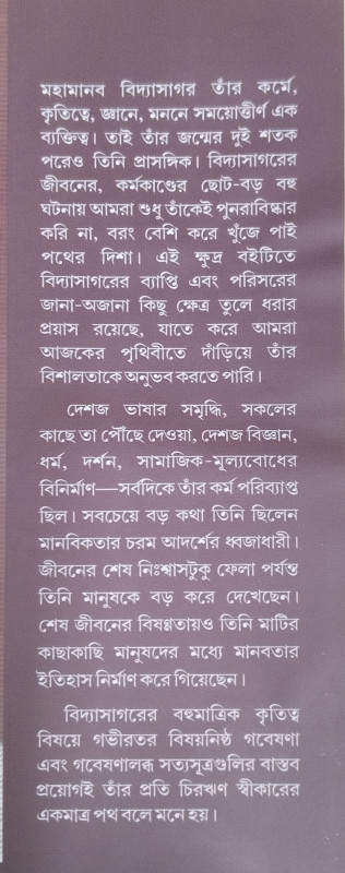 মহামানব বিদ্যাসাগর তাঁর কর্মে, কৃতিত্বে, জ্ঞানে, মননে সময়োত্তীর্ণ এক ব্যক্তিত্ব। তাই তাঁর জন্মের দুই শতক পরেও তিনি প্রাসঙ্গিক। বিদ্যাসাগরের জীবনের, কর্মকাণ্ডের ছোট-বড় বহু ঘটনায় আমরা শুধু তাঁকেই পুনরাবিষ্কার করি না, বরং বেশি করে খুঁজে পাই পথের দিশা। এই ক্ষুদ্র বইটিতে বিদ্যাসাগরের ব্যাপ্তি এবং পরিসরের জানা-অজানা কিছু ক্ষেত্র তুলে ধরার প্রয়াস রয়েছে, যাতে করে আমরা আজকের পৃথিবীতে দাঁড়িয়ে তাঁর বিশালতাকে অনুভব করতে পারি।