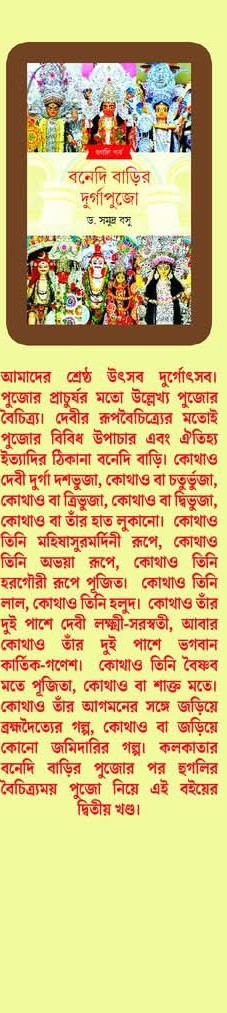 আমাদের শ্রেষ্ঠ উৎসব দুর্গোৎসব। পুজোর প্রাচুর্যর মতো উল্লেখ্য পুজোর বৈচিত্র্য। দেবীর রূপবৈচিত্র্যের মতোই পুজোর বিবিধ উপাচার এবং ঐতিহ্য ইত্যাদির ঠিকানা বনেদি বাড়ি। কোথাও দেবী দুর্গা দশভুজা, কোথাও বা চতুর্ভুজা, কোথাও বা ত্রিভুজা, কোথাও বা দ্বিভুজা, কোথাও বা তাঁর হাত লুকানো। কোথাও তিনি মহিষাসুরমর্দিনী রূপে, কোথাও তিনি অভয়া রূপে, কোথাও তিনি হরগৌরী রূপে পুজিত। কোথাও তিনি লাল, কোথাও তিনি হলুদ। কোথাও তাঁর দুই পাশে দেবী লক্ষ্মী-সরস্বতী, আবার কোথাও তাঁর দুই পাশে ভগবান কার্তিক-গণেশ। কোথাও তিনি বৈষ্ণব মতে পূজিতা, কোথাও বা শাক্ত মতে। কোথাও তাঁর আগমনের সঙ্গে জড়িয়ে ব্রহ্মদৈত্যের গল্প, কোথাও বা জড়িয়ে কোনো জমিদারির গল্প। কলকাতার বনেদি বাড়ির পুজোর পর হুগলির বৈচিত্র্যময় পুজো নিয়ে এই বইয়ের দ্বিতীয় খণ্ড।