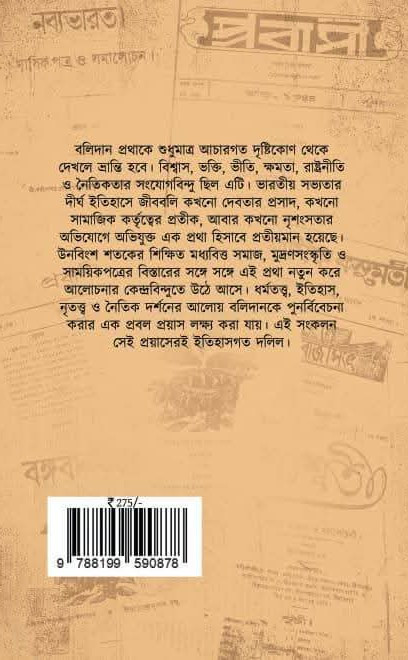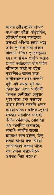আবার বৌদ্ধধর্ম্মের প্রতাপ যখন হ্রাস হইয়া পড়িয়াছিল, বৌদ্ধধর্ম যখন কালক্রমে তন্ত্রধর্মে পরিণত হইয়া পড়ে, তখন পুনরায় নানা প্রকার বলিদান রীতির পুনরোভ্যুদয় হয়। কাপালিক প্রভৃতি কয়েক প্রকার তান্ত্রিকেরা ছাগ মহিষ বলিদানে সন্তুষ্ট না হইয়া নরবলিরও আরম্ভ করে। কালীকরালবদনার রাক্ষসী মূর্ত্তী এই সময়ে সৃষ্ট হয়। হিমালয়ের অপর পার্শ্ববর্তী তিব্বত দেশীয়েরা চামুণ্ডার পূজা করে এবং তন্ত্রমতে তাঁহার নিকট নরবলি প্রদান করিয়া থাকে। কালিকা-পুরাণ সপ্তস্বরে নরবলির মাহাত্ম্য কীর্তন করিয়াছে, বোধ হয় এই নরবলির রূপান্তরে, অদ্যাপি আত্মীয় জনের আরোগ্য লাভ হইলে, হিন্দু ললনা আপন বক্ষ চিরিয়া শোণিতসুধা কাঞ্চন পাত্রে লাল-রসনা মহাদেবীকে উপহার দিয়া থাকে।"