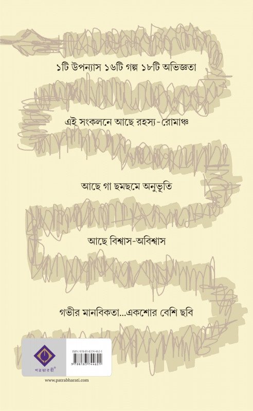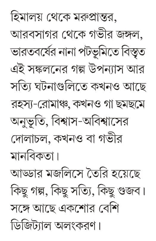 হিমালয় থেকে মরুপ্রান্তর, আরবসাগর থেকে গভীর জঙ্গল, ভারতবর্ষের নানা পটভূমিতে বিস্তৃত এই সঙ্কলনের গল্প উপন্যাস আর সত্যি ঘটনাগুলিতে কখনও আছে রহস্য-রোমাঞ্চ, কখনও গা ছমছমে অনুভূতি, বিশ্বাস-অবিশ্বাসের দোলাচল, কখনও বা গভীর মানবিকতা।