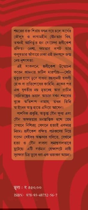 পাশবিক প্রবৃত্তি, অতৃপ্ত যৌন ক্ষুধা এবং যৌন অক্ষমতার মনস্তাত্ত্বিক জ্যে প্রেম যেখানে নিশ্চিহং সেগানে হত্যাই একমাত্র নিয়ম। হৃষীকেশ রক্ষিত পাঠকদের নিয়ে যাবেন সেইসব অন্ধকার গলিতে, যেখানে হত্যা ও যৌন লালসা সমান্তরালভাবে ছুটেছে। এটি বর্তমান প্রেক্ষাপটে নারী সুরক্ষার চিত্র তুলে ধরা এক ভয়ংকর আয়না।