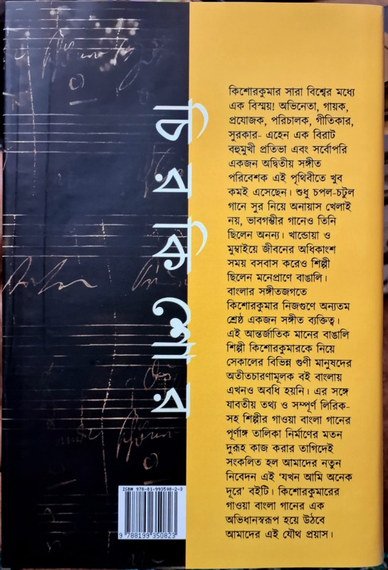 বাংলার সঙ্গীতজগতে কিশোরকুমার নিজগুণে অন্যতম শ্রেষ্ঠ একজন সঙ্গীত ব্যক্তিত্ব। এই আন্তর্জাতিক মানের বাঙালি শিল্পী কিশোরকুমারকে নিয়ে সেকালের বিভিন্ন গুণী মানুষদের অতীতচারণামূলক বই বাংলায় এখনও অবধি হয়নি। এর সঙ্গে যাবতীয় তথ্য ও সম্পূর্ণ লিরিক-সহ শিল্পীর গাওয়া বাংলা গানের পূর্ণাঙ্গ তালিকা নির্মাণের মতন দুরূহ কাজ করার তাগিদেই সংকলিত হল আমাদের নতুন নিবেদন এই 'যখন আমি অনেক দূরে' বইটি। কিশোরকুমারের গাওয়া বাংলা গানের এক অভিধানস্বরূপ হয়ে উঠবে আমাদের এই যৌথ প্রয়াস।
