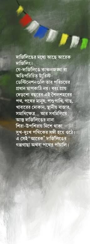 দার্জিলিঙের মধ্যে আছে আরেক দার্জিলিঙ। যে-দার্জিলিঙে কাঞ্চনজঙ্ঘা বা অতিপরিচিত ট্যুরিস্ট-ডেস্টিনেশনগুলি তার পরিচয়ের প্রধান মাপকাঠি নয়। বরং প্রায় দেড়শো বছরের এই শৈলশহরের পথ, পথের মানুষ, পশুপাখি, গাছ, খাবারের দোকান, স্থানীয় বাজার, সমাধিক্ষেত্র... আর সবমিলিয়ে আস্ত দার্জিলিঙের নানা শিরা-উপশিরায় মিশে থাকা সুখ-দুঃখ পথিকের সঙ্গী হয়ে ওঠে। এ সেই 'আরেক' দার্জিলিঙের গপ্পগাছা অথবা পথের পাঁচালি।