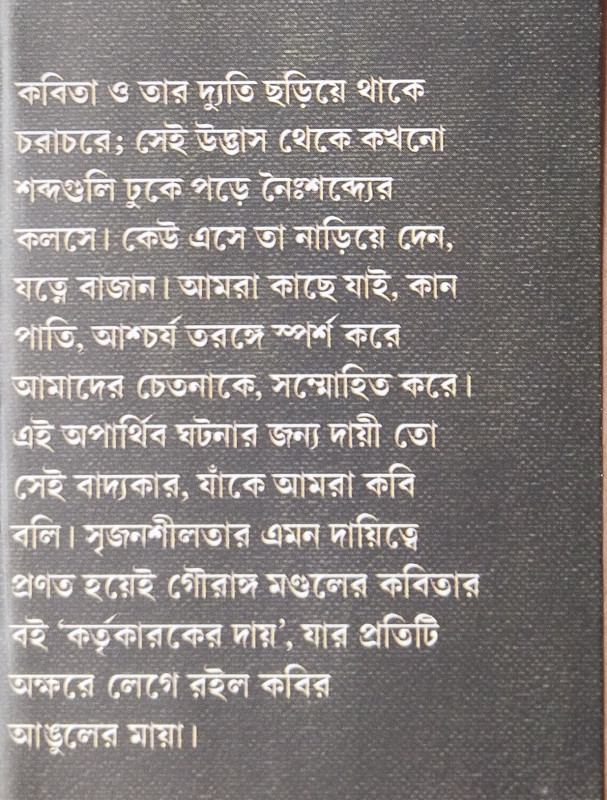 কবিতা ও তার দ্যুতি ছড়িয়ে থাকে চরাচরে; সেই উদ্ভাস থেকে কখনো শব্দগুলি ঢুকে পড়ে নৈঃশব্দ্যের কলসে। কেউ এসে তা নাড়িয়ে দেন, যত্নে বাজান। আমরা কাছে যাই, কান পাতি, আশ্চর্য তরঙ্গে স্পর্শ করে আমাদের চেতনাকে, সম্মোহিত করে। এই অপার্থিব ঘটনার জন্য দায়ী তো সেই বাদ্যকার, যাঁকে আমরা কবি বলি। সৃজনশীলতার এমন দায়িত্বে প্রণত হয়েই গৌরাঙ্গ মণ্ডলের কবিতার বই 'কর্তৃকারকের দায়', যার প্রতিটি অক্ষরে লেগে রইল কবির আঙুলের মায়া।