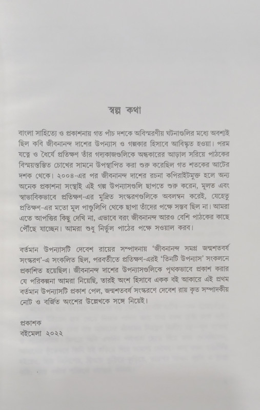 দেবেশ রায় সম্পাদিত, মূল পান্ডুলিপি থেকে মুদ্রিত। মূল খাতায় জীবনানন্দ দাশ যে অংশগুলি কাটাকুটি করে বাদ দিয়েছিলেন, তা'ও এখানে সংযোজিত হয়েছে।
