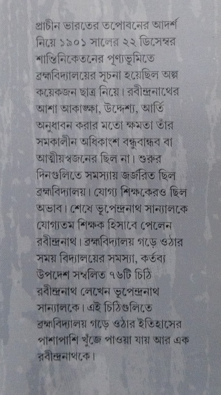 প্রাচীন ভারতের তপোবনের আদর্শ নিয়ে ১৯০১ সালের ২২ ডিসেম্বর শান্তিনিকেতনের পূণ্যভূমিতে ব্রহ্মবিদ্যালয়ের সূচনা হয়েছিল অল্প কয়েকজন ছাত্র নিয়ে। রবীন্দ্রনাথের আশা আকাঙ্ক্ষা, উদ্দেশ্য, আর্তি অনুধাবন করার মতো ক্ষমতা তাঁর সমকালীন অধিকাংশ বন্ধুবান্ধব বা আত্মীয়স্বজনের ছিল না। শুরুর দিনগুলিতে সমস্যায় জর্জরিত ছিল ব্রহ্মবিদ্যালয়। যোগ্য শিক্ষকেরও ছিল অভাব। শেষে ভূপেন্দ্রনাথ সান্যালকে যোগ্যতম শিক্ষক হিসাবে পেলেন রবীন্দ্রনাথ। ব্রহ্মবিদ্যালয় গড়ে ওঠার সময় বিদ্যালয়ের সমস্যা, কর্তব্য উপদেশ সম্বলিত ৭৬টি চিঠি রবীন্দ্রনাথ লেখেন ভূপেন্দ্রনাথ সান্যালকে। এই চিঠিগুলিতে ব্রহ্মবিদ্যালয় গড়ে ওঠার ইতিহাসের পাশাপাশি খুঁজে পাওয়া যায় আর এক রবীন্দ্রনাথকে।