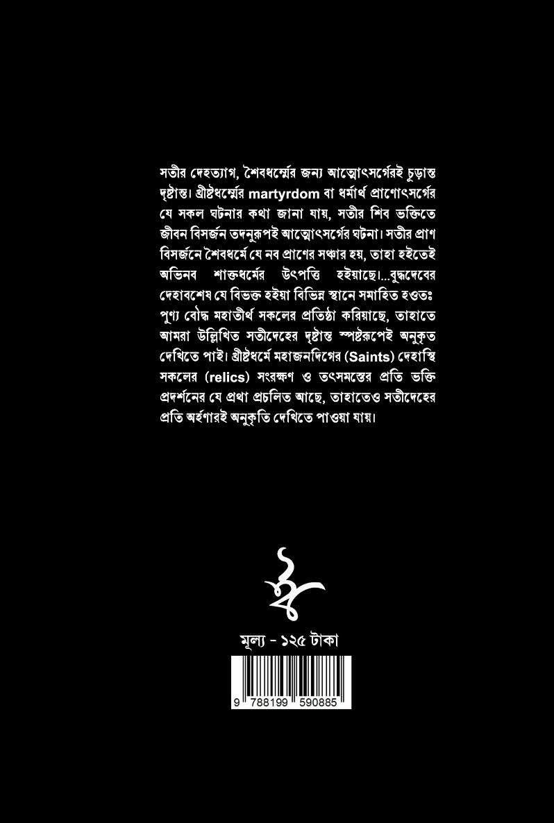 সতীর দেহত্যাগ, শৈবধর্ম্মের জন্য আত্মোৎসর্গেরই চূড়ান্ত দৃষ্টান্ত। খ্রীষ্টধর্ম্মের martyrdom বা ধর্মার্থ প্রাণোৎসর্গের যে সকল ঘটনার কথা জানা যায়, সতীর শিব ভক্তিতে জীবন বিসর্জন তদনুরূপই আত্মোৎসর্গের ঘটনা। সতীর প্রাণ বিসর্জনে শৈবধর্মে যে নব প্রাণের সঞ্চার হয়, তাহা হইতেই অভিনব শাক্তধর্মের উৎপত্তি হইয়াছে।... বুদ্ধদেবের দেহাবশেষ যে বিভক্ত হইয়া বিভিন্ন স্থানে সমাহিত হওতঃ পুণ্য বৌদ্ধ মহাতীর্থ সকলের প্রতিষ্ঠা করিয়াছে, তাহাতে আমরা উল্লিখিত সতীদেহের দৃষ্টান্ত স্পষ্টরূপেই অনুকৃত দেখিতে পাই। খ্রীষ্টধর্মে মহাজনদিগের (Saints) দেহাস্থি সকলের (relics) সংরক্ষণ ও তৎসমস্তের প্রতি ভক্তি প্রদর্শনের যে প্রথা প্রচলিত আছে, তাহাতেও সতীদেহের প্রতি অর্হণারই অনুকৃতি দেখিতে পাওয়া যায়।