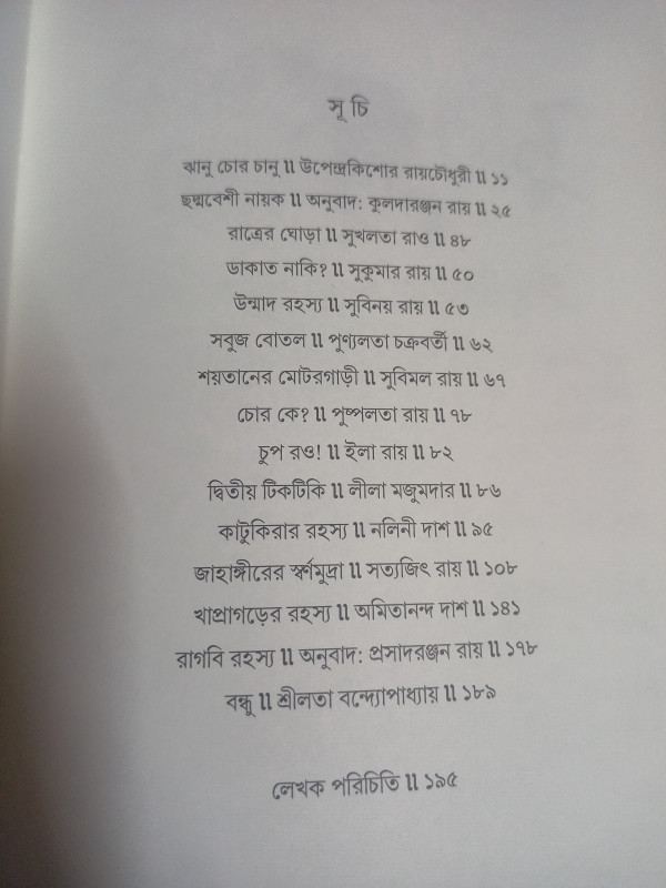 উপেন্দ্রকিশোর থেকে শুরু করে ওঁর ভাই, পুত্র-কন্যা, পুত্রবধূ, ভ্রাতুষ্পুত্রী, নাতি এবং তারও পরের প্রজন্ম-কেউই বাদ যাননি রহস্য গল্পের লেখক তালিকা থেকে। সঙ্গে দাদু এবং বাবা যেসব গল্পে ছবি এঁকেছেন, সেসব অলংকরণও গেল এই সংকলনে।