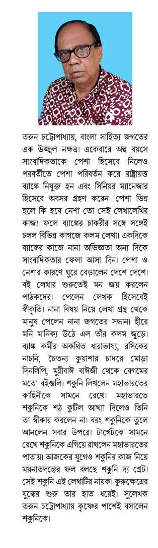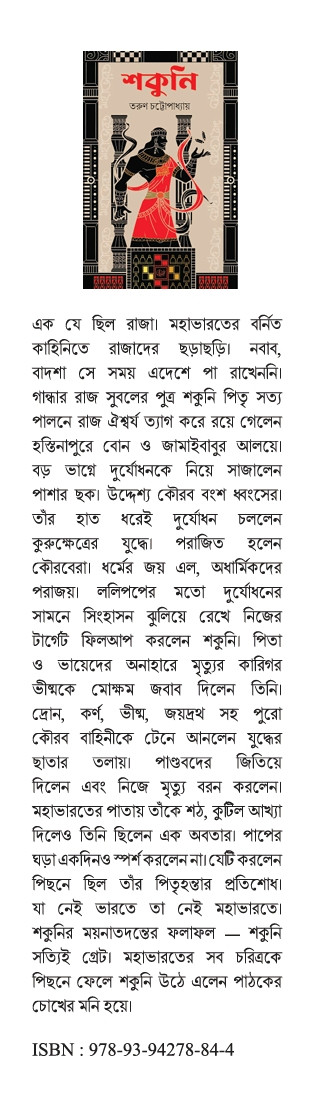 এক যে ছিল রাজা। মহাভারতের বর্নিত কাহিনিতে রাজাদের ছড়াছড়ি। নবাব, বাদশা সে সময় এদেশে পা রাখেননি। গান্ধার রাজ সুবলের পুত্র শকুনি পিতৃ সত্য পালনে রাজ ঐশ্বর্য ত্যাগ করে রয়ে গেলেন হস্তিনাপুরে বোন ও জামাইবাবুর আলয়ে। বড় ভাগ্নে দুর্যোধনকে নিয়ে সাজালেন পাশার ছক। উদ্দেশ্য কৌরব বংশ ধ্বংসের। তাঁর হাত ধরেই দুর্যোধন চললেন কুরুক্ষেত্রের যুদ্ধে। পরাজিত হলেন কৌরবেরা। ধর্মের জয় এল, অধার্মিকদের পরাজয়। ললিপপের মতো দুর্যোধনের সামনে সিংহাসন ঝুলিয়ে রেখে নিজের টার্গেট ফিলআপ করলেন শকুনি। পিতা ও ভায়েদের অনাহারে মৃত্যুর কারিগর ভীষ্মকে মোক্ষম জবাব দিলেন তিনি। দ্রোন, কর্ণ, ভীষ্ম, জয়দ্রথ সহ পুরো কৌরব বাহিনীকে টেনে আনলেন যুদ্ধের ছাতার তলায়। পাণ্ডবদের জিতিয়ে দিলেন এবং নিজে মৃত্যু বরন করলেন। মহাভারতের পাতায় তাঁকে শঠ, কুটিল আখ্যা দিলেও তিনি ছিলেন এক অবতার। পাপের ঘড়া একদিনও স্পর্শ করলেন না। যেটি করলেন পিছনে ছিল তাঁর পিতৃহন্তার প্রতিশোধ। যা নেই ভারতে তা নেই মহাভারতে। শকুনি সত্যিই গ্রেট। মহাভারতের সব চরিত্রকে শকুনির ময়নাতদন্তের ফলাফল পিছনে ফেলে শকুনি উঠে এলেন পাঠকের চোখের মনি হয়ে।