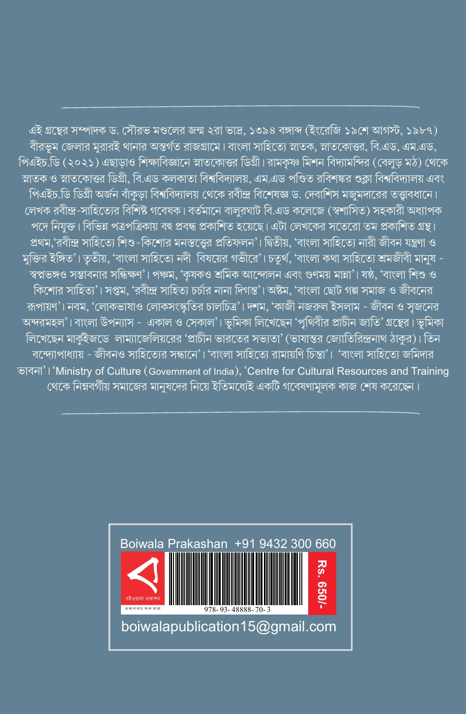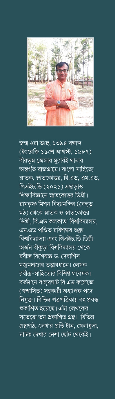 লেখক পরিচিতি : জন্ম ২রা ভাদ্র, ১৩৯৪ বঙ্গাব্দ (ইংরেজি ১৯শে আগস্ট, ১৯৮৭) বীরভূম জেলার মুরারই থানার অন্তর্গত রাজগ্রামে। বাংলা সাহিত্যে স্নাতক, স্নাতকোত্তর, বি.এড, এম.এড, পিএইচ.ডি (২০২১) এছাড়াও শিক্ষাবিজ্ঞানে স্নাতকোত্তর ডিগ্রী। রামকৃষ্ণ মিশন বিদ্যামন্দির (বেলুড় মঠ) থেকে স্নাতক ও স্নাতকোত্তর ডিগ্রী, বি.এড কলকাতা বিশ্ববিদ্যালয়, এম.এড পণ্ডিত রবিশঙ্কর শুক্লা বিশ্ববিদ্যালয় এবং পিএইচ.ডি ডিগ্রী অর্জন বাঁকুড়া বিশ্ববিদ্যালয় থেকে রবীন্দ্র বিশেষজ্ঞ ড. দেবাশিস মজুমদারের তত্ত্বাবধানে। লেখক রবীন্দ্র-সাহিত্যের বিশিষ্ট গবেষক। বর্তমানে বালুরঘাট বি.এড কলেজে (স্বশাসিত) সহকারী অধ্যাপক পদে নিযুক্ত। বিভিন্ন পত্রপত্রিকায় বহু প্রবন্ধ প্রকাশিত হয়েছে। এটা লেখকের সতেরো তম প্রকাশিত গ্রন্থ। বিভিন্ন গ্রন্থপাঠ, লেখার প্রতি টান, খেলাধুলা, নাটক দেখার নেশা ছোট থেকেই।