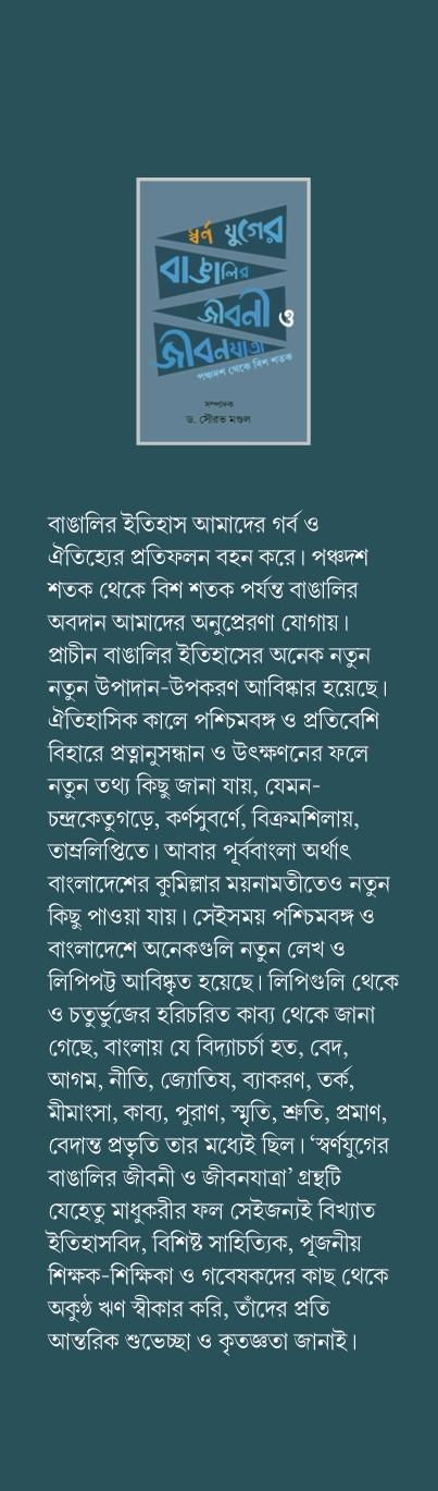 প্রাচীন বাঙালির ইতিহাসের অনেক নতুন নতুন উপাদান-উপকরণ আবিষ্কার হয়েছে। ঐতিহাসিক কালে পশ্চিমবঙ্গ ও প্রতিবেশি বিহারে প্রত্নানুসন্ধান ও উৎক্ষণনের ফলে নতুন তথ্য কিছু জানা যায়, যেমন-চন্দ্রকেতুগড়ে, কর্ণসুবর্ণে, বিক্রমশিলায়, তাম্রলিপ্তিতে। আবার পূর্ববাংলা অর্থাৎ বাংলাদেশের কুমিল্লার ময়নামতীতেও নতুন কিছু পাওয়া যায়। সেইসময় পশ্চিমবঙ্গ ও বাংলাদেশে অনেকগুলি নতুন লেখ ও লিপিপট্ট আবিষ্কৃত হয়েছে। লিপিগুলি থেকে ও চতুর্ভুজের হরিচরিত কাব্য থেকে জানা গেছে, বাংলায় যে বিদ্যাচর্চা হত, বেদ, আগম, নীতি, জ্যোতিষ, ব্যাকরণ, তর্ক, মীমাংসা, কাব্য, পুরাণ, স্মৃতি, শ্রুতি, প্রমাণ, বেদান্ত প্রভৃতি তার মধ্যেই ছিল। 'স্বর্ণযুগের বাঙালির জীবনী ও জীবনযাত্রা' গ্রন্থটি যেহেতু মাধুকরীর ফল সেইজন্যই বিখ্যাত ইতিহাসবিদ, বিশিষ্ট সাহিত্যিক, পূজনীয় শিক্ষক-শিক্ষিকা ও গবেষকদের কাছ থেকে অকুণ্ঠ ঋণ স্বীকার করি, তাঁদের প্রতি আন্তরিক শুভেচ্ছা ও কৃতজ্ঞতা জানাই।