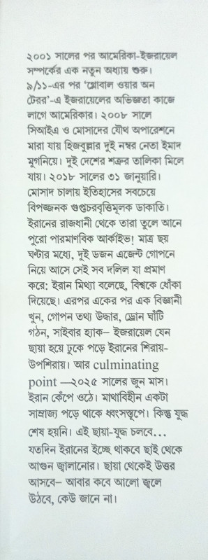 ২০০১ সালের পর আমেরিকা-ইজরায়েল সম্পর্কের এক নতুন অধ্যায় শুরু। ৯/১১-এর পর 'গ্লোবাল ওয়ার অন টেরর'-এ ইজরায়েলের অভিজ্ঞতা কাজে লাগে আমেরিকার। ২০০৮ সালে সিআইএ ও মোসাদের যৌথ অপারেশনে মারা যায় হিজবুল্লার দুই নম্বর নেতা ইমাদ মুগনিয়ে। দুই দেশের শত্রুর তালিকা মিলে যায়। ২০১৮ সালের ৩১ জানুয়ারি। মোসাদ চালায় ইতিহাসের সবচেয়ে বিপজ্জনক গুপ্তচরবৃত্তিমূলক ডাকাতি। ইরানের রাজধানী থেকে তারা তুলে আনে পুরো পারমাণবিক আর্কাইভ! মাত্র ছয় ঘণ্টার মধ্যে, দুই ডজন এজেন্ট গোপনে নিয়ে আসে সেই সব দলিল যা প্রমাণ করে: ইরান মিথ্যা বলেছে, বিশ্বকে ধোঁকা দিয়েছে। এরপর একের পর এক বিজ্ঞানী খুন, গোপন তথ্য উদ্ধার, ড্রোন ঘাঁটি গঠন, সাইবার হ্যাক- ইজরায়েল যেন ছায়া হয়ে ঢুকে পড়ে ইরানের শিরায়-উপশিরায়। আর culminating point-২০২৫ সালের জুন মাস। ইরান কেঁপে ওঠে। মাথাবিহীন একটা সাম্রাজ্য পড়ে থাকে ধ্বংসস্তূপে। কিন্তু যুদ্ধ শেষ হয়নি। এই ছায়া-যুদ্ধ চলবে... যতদিন ইরানের ইচ্ছে থাকবে ছাই থেকে আগুন জ্বালানোর। ছায়া থেকেই উত্তর আসবে- আবার কবে আলো জ্বলে উঠবে, কেউ জানে না।