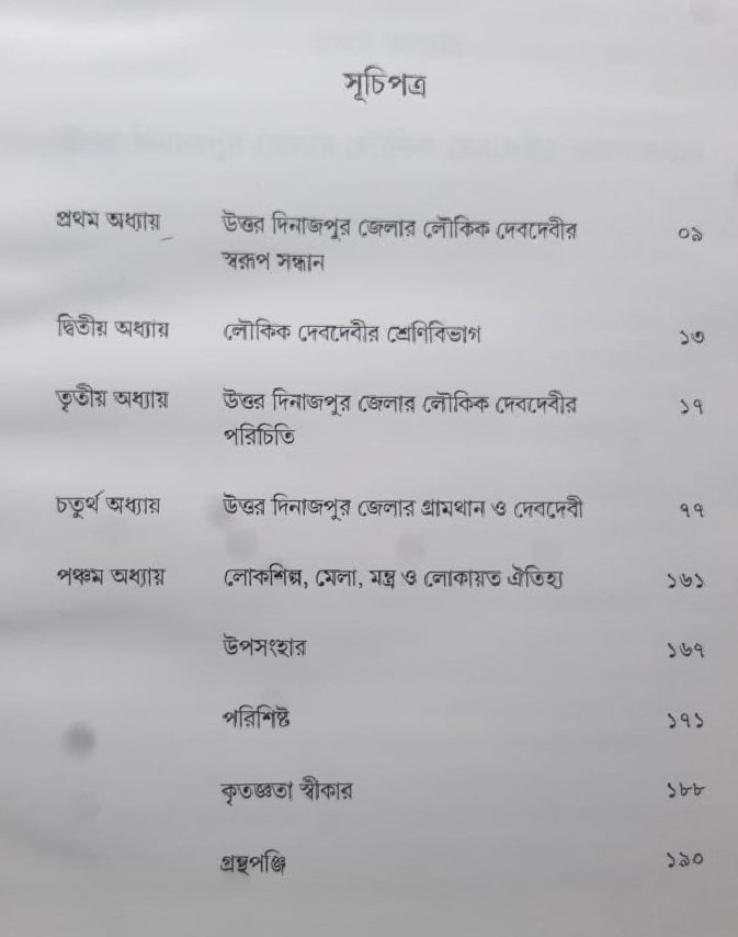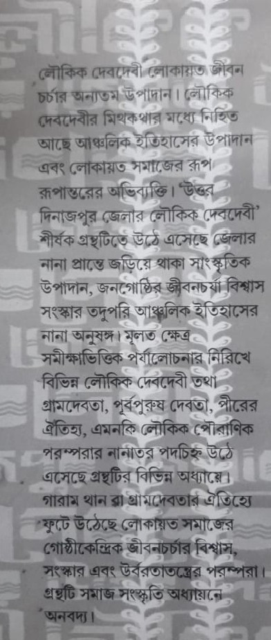 লৌকিক দেবদেবী লোকায়ত জীবন চর্চার অন্যতম উপাদান। লৌকিক দেবদেবীর মিথকথার মধ্যে নিহিত আছে আঞ্চলিক ইতিহাসের উপাদান এবং লোকায়ত সমাজের রূপ রূপান্তরের অভিব্যক্তি। 'উত্তর দিনাজপুর জেলার লৌকিক দেবদেবী' শীর্ষক গ্রন্থটিতে উঠে এসেছে জেলার নানা প্রান্তে জড়িয়ে থাকা সাংস্কৃতিক উপাদান, জনগোষ্ঠির জীবনচর্যা বিশ্বাস সংস্কার তদুপরি আঞ্চলিক ইতিহাসের নানা অনুষঙ্গ। মূলত ক্ষেত্র সমীক্ষাভিত্তিক পর্যালোচনার নিরিখে বিভিন্ন লৌকিক দেবদেবী তথা গ্রামদেবতা, পূর্বপুরুষ দেবতা, পীরের ঐতিহ্য, এমনকি লৌকিক পৌরাণিক পরম্পরার নানাতর পদচিহ্ন উঠে এসেছে গ্রন্থটির বিভিন্ন অধ্যায়ে। গারাম থান রা গ্রামদেবতার ঐতিহ্যে ফুটে উঠেছে লোকায়ত সমাজের গোষ্ঠীকেন্দ্রিক জীবনচর্চার বিশ্বাস, সংস্কার এবং উর্বরতাতন্ত্রের পরম্পরা। গ্রন্থটি সমাজ সংস্কৃতি অধ্যায়নে অনবদ্য।